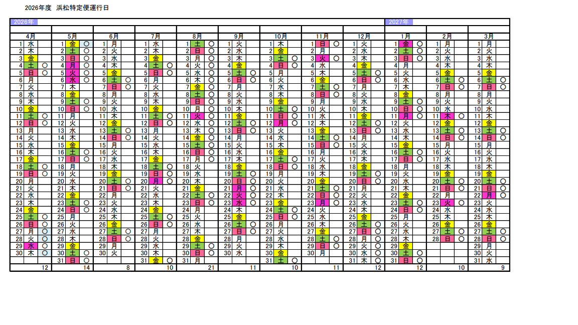 2026年度の特定日運行便の運行日程をお知らせいたします。