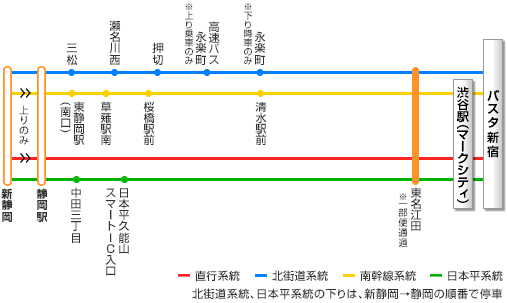 【運行会社】 KO:京王バス株式会社 JT:ジェイアール東海バス株式会社 JR:JRバス関東株式会社 STJ:しずてつジャストライン株式会社平日朝・夕の自然渋滞や行楽シーズンなどの道路事情により所要時分が異なりますので、余裕を持ってご利用くださいますようお願い申し上げます。また、遅延などで発生した損害などについては、運行会社ではその責任は一切負いかねますので予めご了承ください。