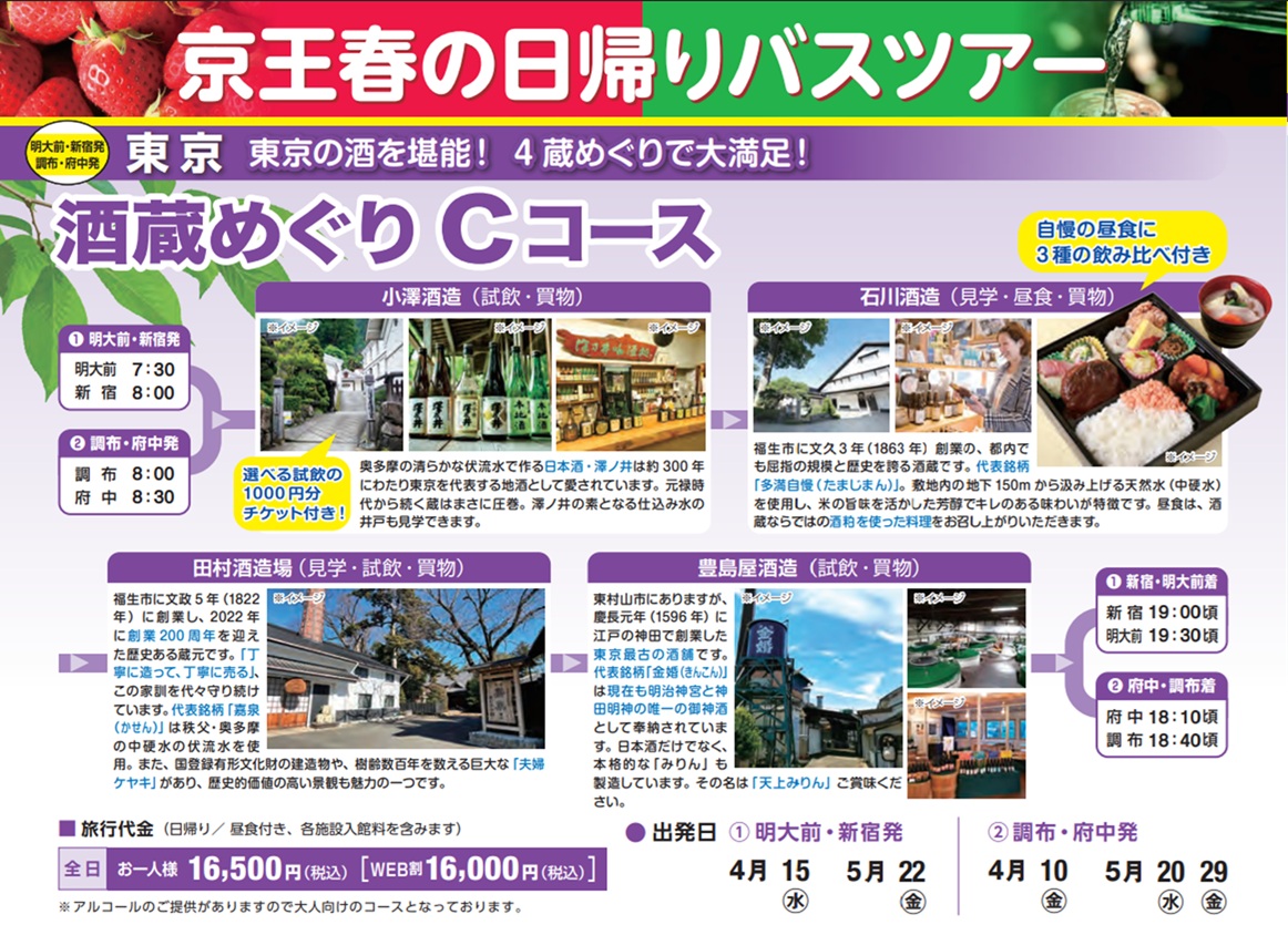 京王観光でお支払いの場合:大人16,500円 WEBサイトからクレジットまたはキャリア決済でお支払いの場合:大人16,000円※こども料金の設定はございません。※必ず事前のお支払いが必要になります。(期限を過ぎると自動的に取り消しとなります)オンライン決済、またはお近くの京王観光にてお支払いの上で乗り場にお越しください。○キャンセルポリシー旅行開始日の前日から起算してさかのぼって1) 11日目にあたる日以前の解除 無料2) 10日目にあたる日から8日前までの解除 旅行代金の20%3) 7日目にあたる日から2日前までの解除 旅行代金の30%4) 旅行開始日の前日の解除 旅行代金の40%5) 当日の解除(6を除く) 旅行代金の50%6) 旅行開始後の解除または無連絡不参加 旅行代金の100% 出発日の変更は、予約またはお支払いをされたところで、ご乗車日の2日前までに行ってください。ご乗車日の前日または当日には、変更はできません。