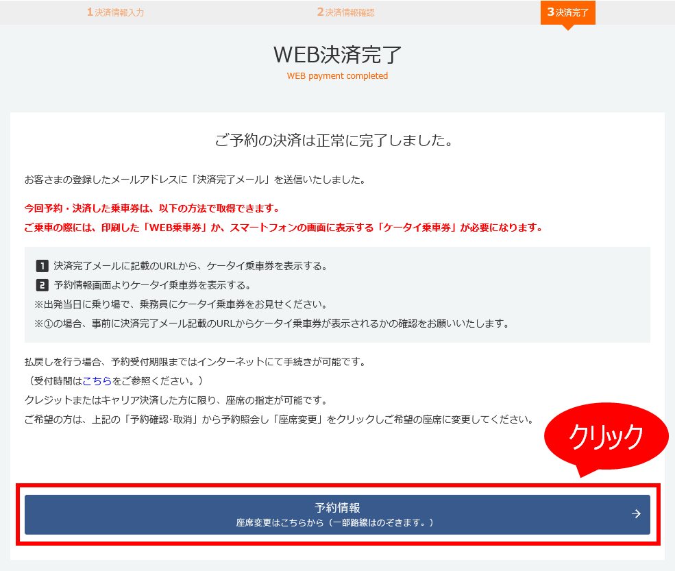 - ③「座席を指定する」をクリックして手続きは完了です。4の予約情報の画面に戻ります。